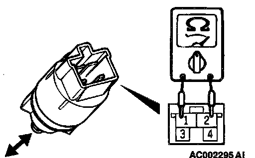 2. Connect an ohmmeter to the stoplight switch terminals 1 and 2, and check whether there is continuity when the plunger of the stoplight switch is pushed in and when it is released.