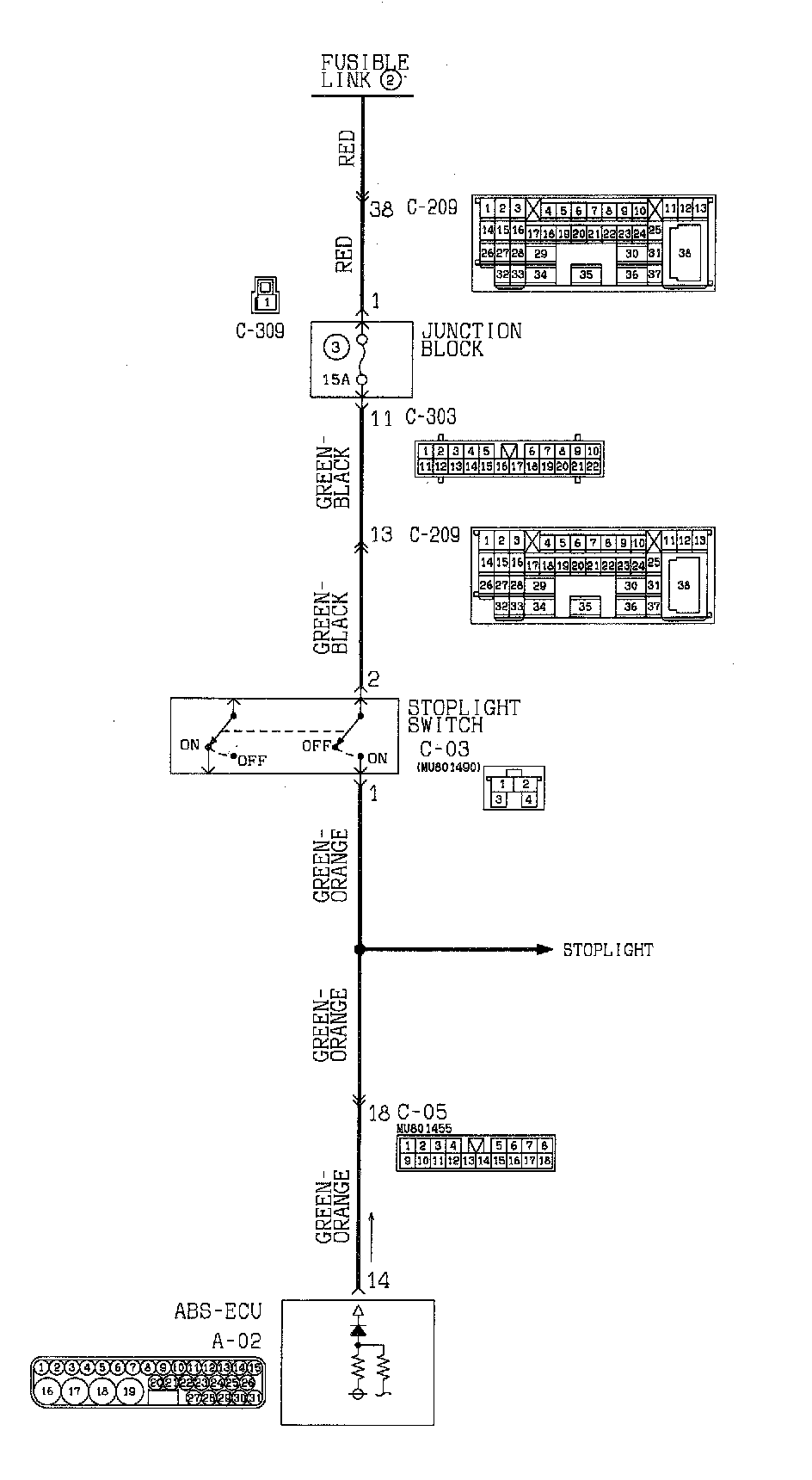 STEP 5. Check the harness wire between ABS-ECU connector A-02 and stoplight switch connector C-03.
