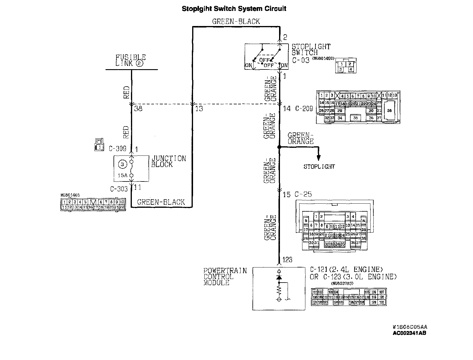 STEP 7. Check harness for damage between stoplight switch connector C-03 terminal 1 and PCM connector C121 <2.4L Engine> or C-123 <3.0L Engine> terminal 123.