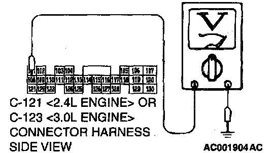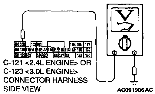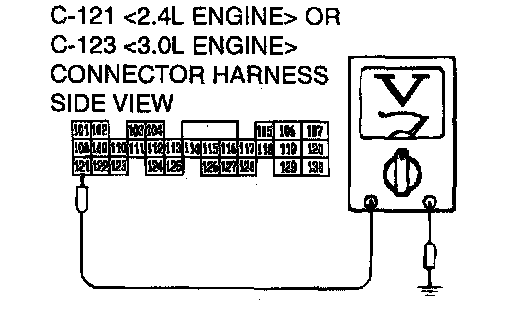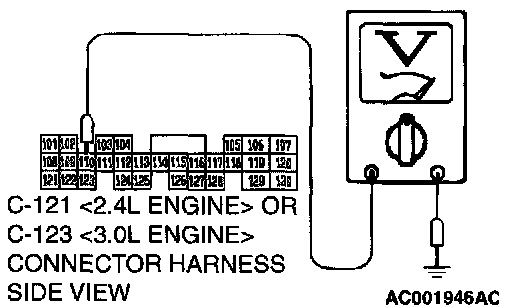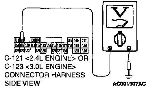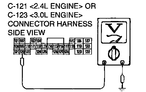 STEP 7. Check the switch output voltage at PCM connector C-121 <2.4L Engine> or C-123 <3.0L Engine> by backprobing.