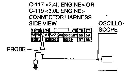 2) Connect an oscilloscope probe to the PCM connector C11 7 <2.4L Engine> or C-119 <3.0L Engine> terminal 80 by backprobing.