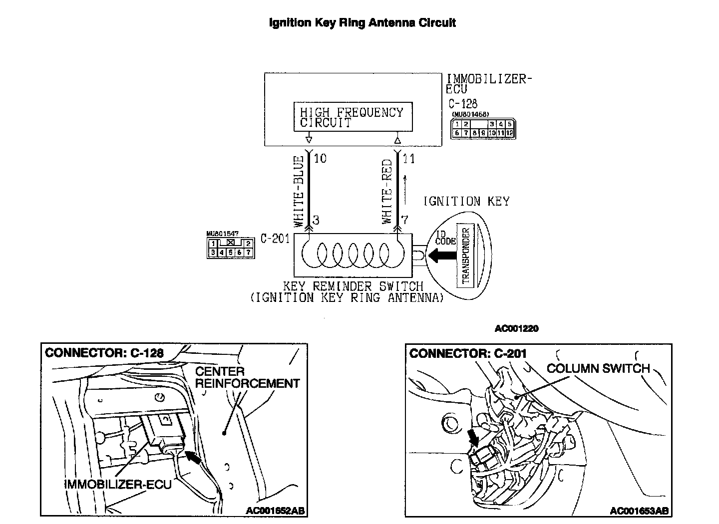 Q: Are immobilizer-ECU connector C-128 and ignition key ring antenna connector C-201 in good condition?