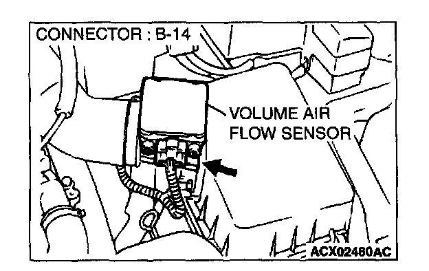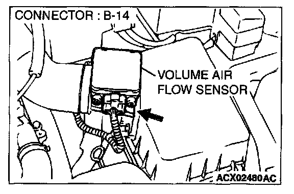 STEP 4. Check connector B-14 at the volume air flow sensor for damage.