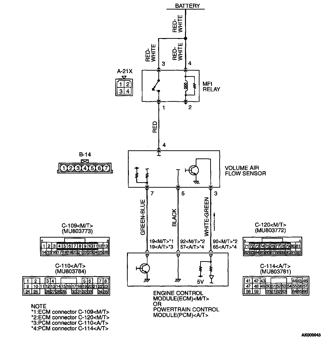 - The volume air flow sensor power is supplied from the MFI relay (terminal 1), and the ground is provided on the ECM (terminal 92)