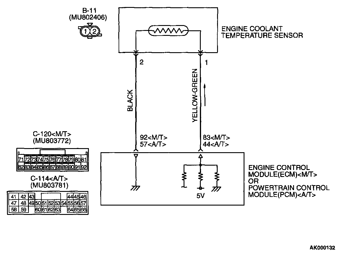- 5-volt voltage is applied to the engine coolant temperature sensor output terminal (terminal 1) from the ECM (terminal 83)