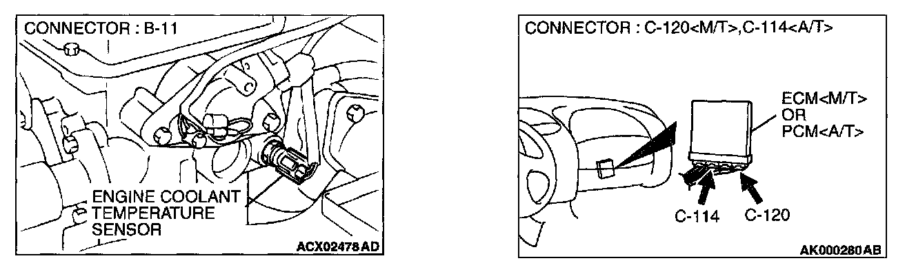 STEP 10. Check for harness damage between engine coolant temperature sensor connector B-11 terminal 2 and ECM connector C-120 terminal 92