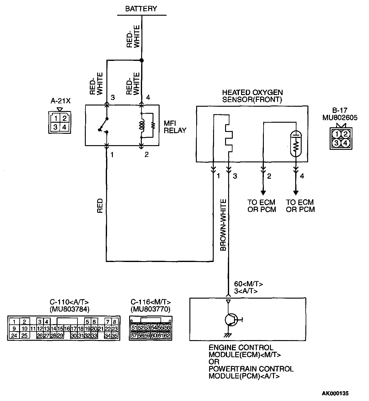 STEP 9. Check for harness damage between MFI relay connector A-21X terminal 1 and heated oxygen sensor (front) connector B-17 terminal 1.