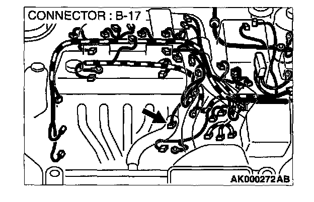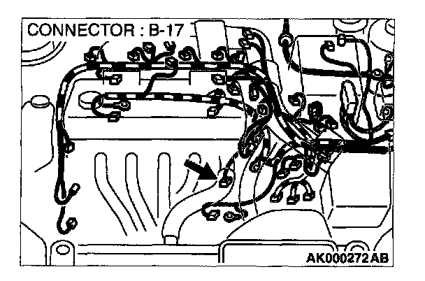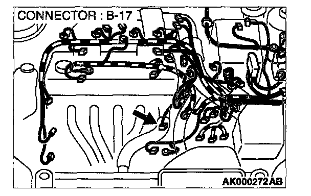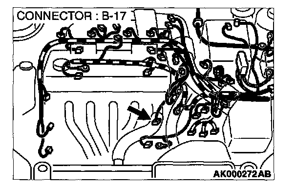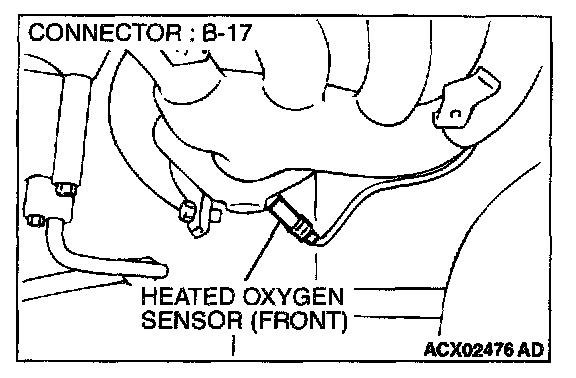 1. Disconnect heated oxygen sensor (front) connector B-17 and connect test harness special tool, MD998464, to the connector on the heated oxygen (front) sensor side.