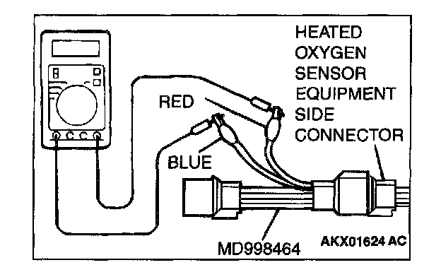 2. Measure the resistance between heated oxygen sensor connector terminal 1 (red clip) and terminal 3 (blue clip).