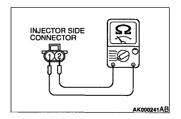 2. Measure the resistance between injector side connector terminal 1 and 2.