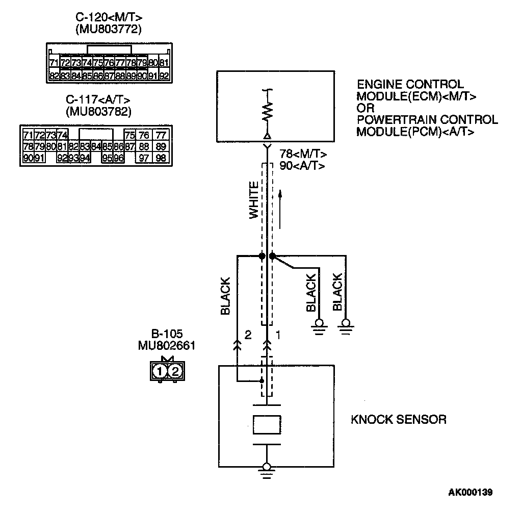 STEP 4. Check for open circuit, short circuit to ground and harness damage between knock sensor connector B-105 terminal 1 and ECM connector C-120 terminal 78