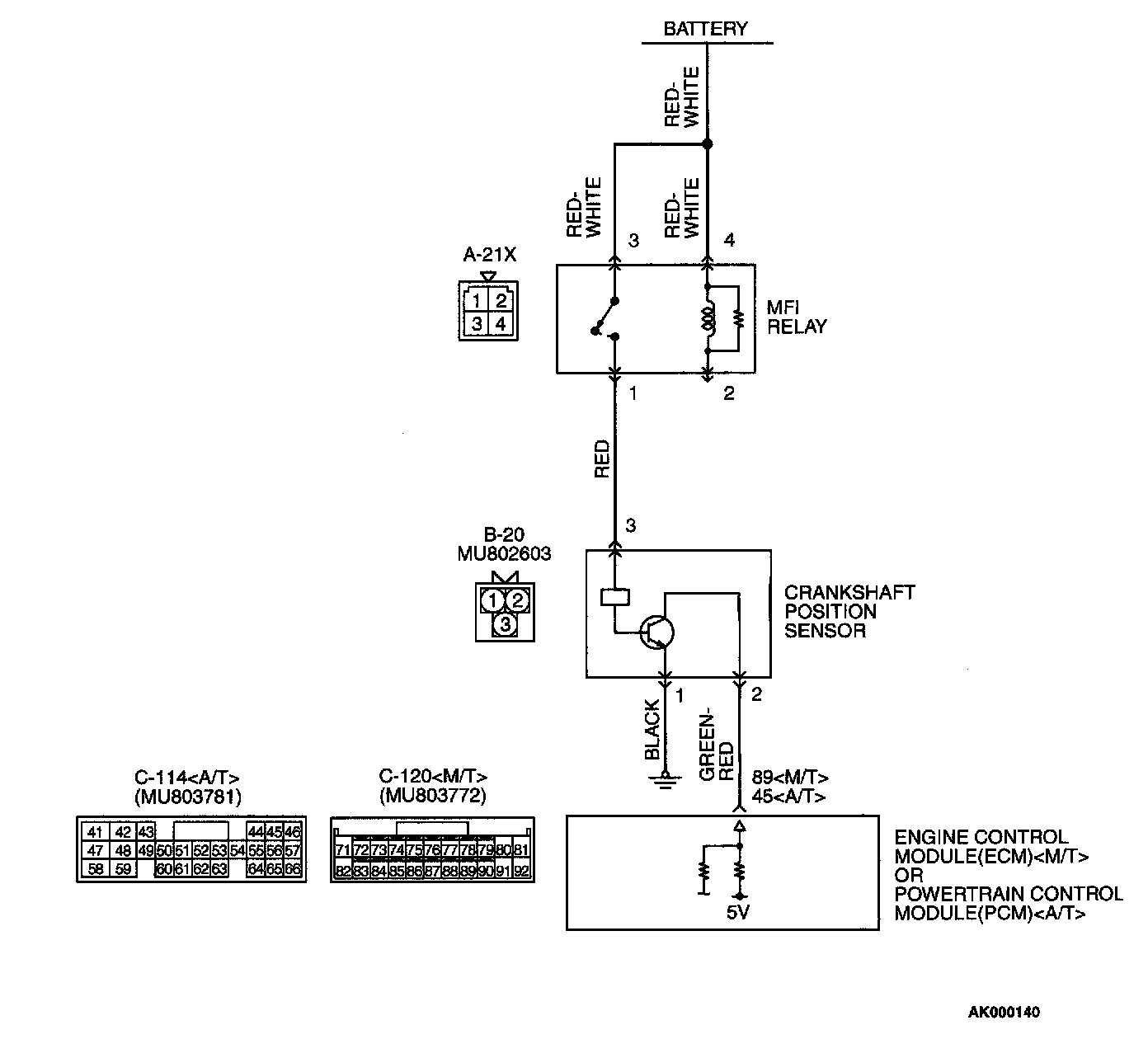 - A 5-volt voltage is applied on the crankshaft position sensor output terminal (terminal 2) from the ECM (terminal 89)