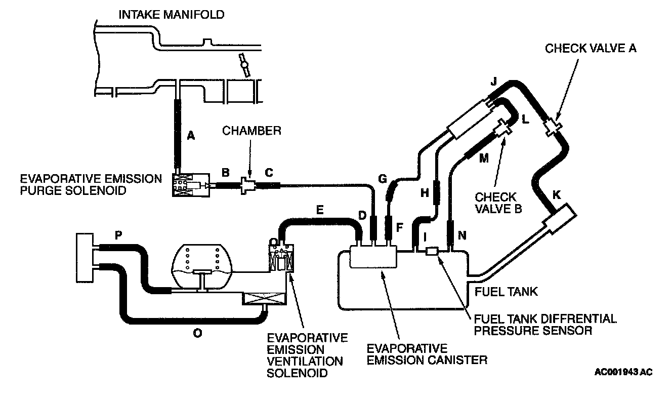 - A voltage proportional to the pressure in the fuel tank is sent from the output terminal of the fuel tank differential pressure sensor (terminal 1) to the ECM (terminal 61)