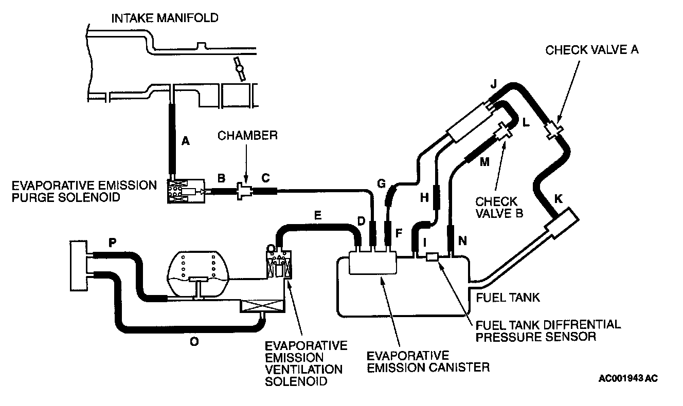 - A voltage proportional to the pressure in the fuel tank is sent from the output terminal of the fuel tank differential pressure sensor (terminal 1) to the ECM (terminal 61)