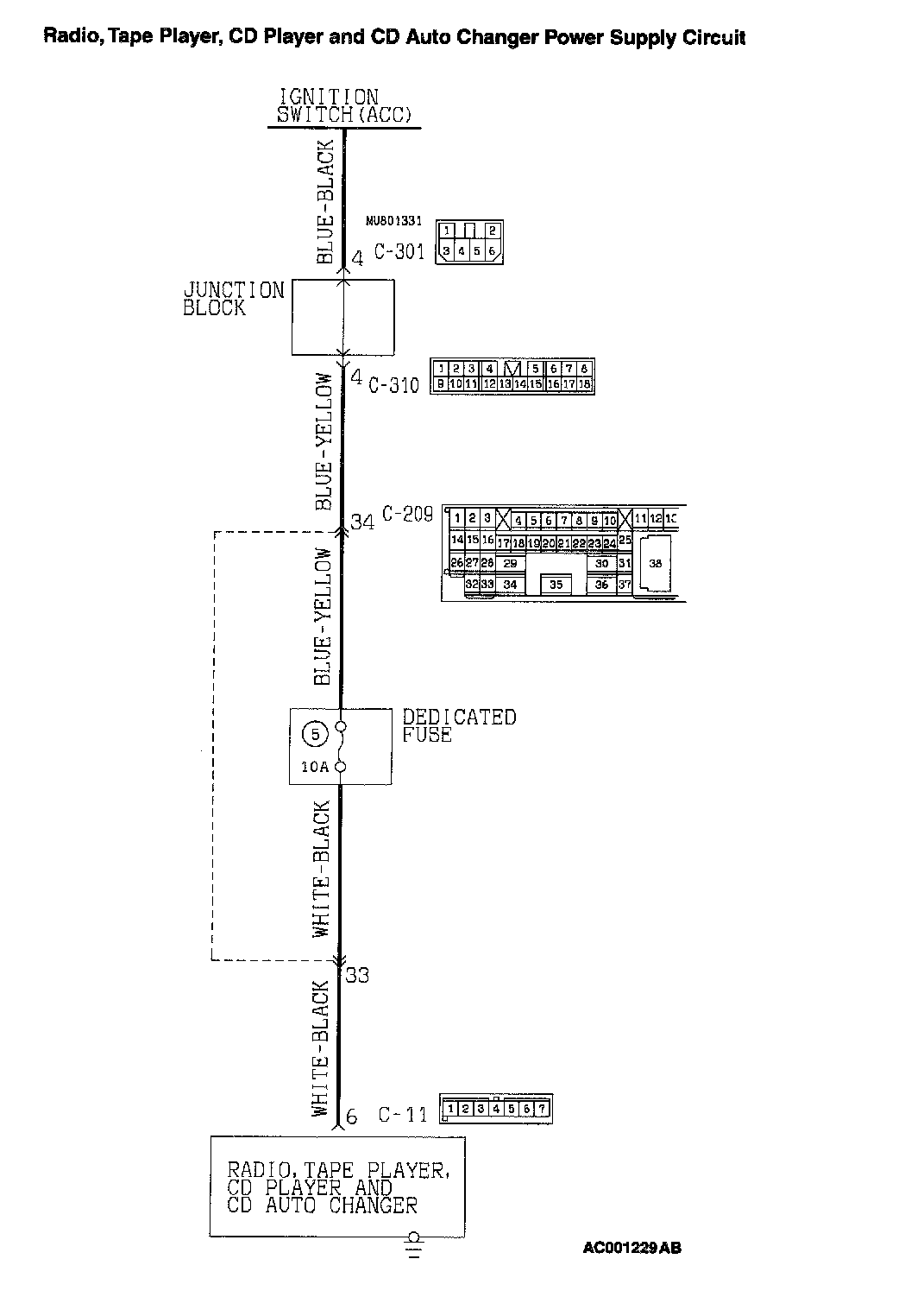 Power is supplied to the radio, tape player, CD player and CD auto changer when the ignition switch is at the "ACC" or "ON" position.