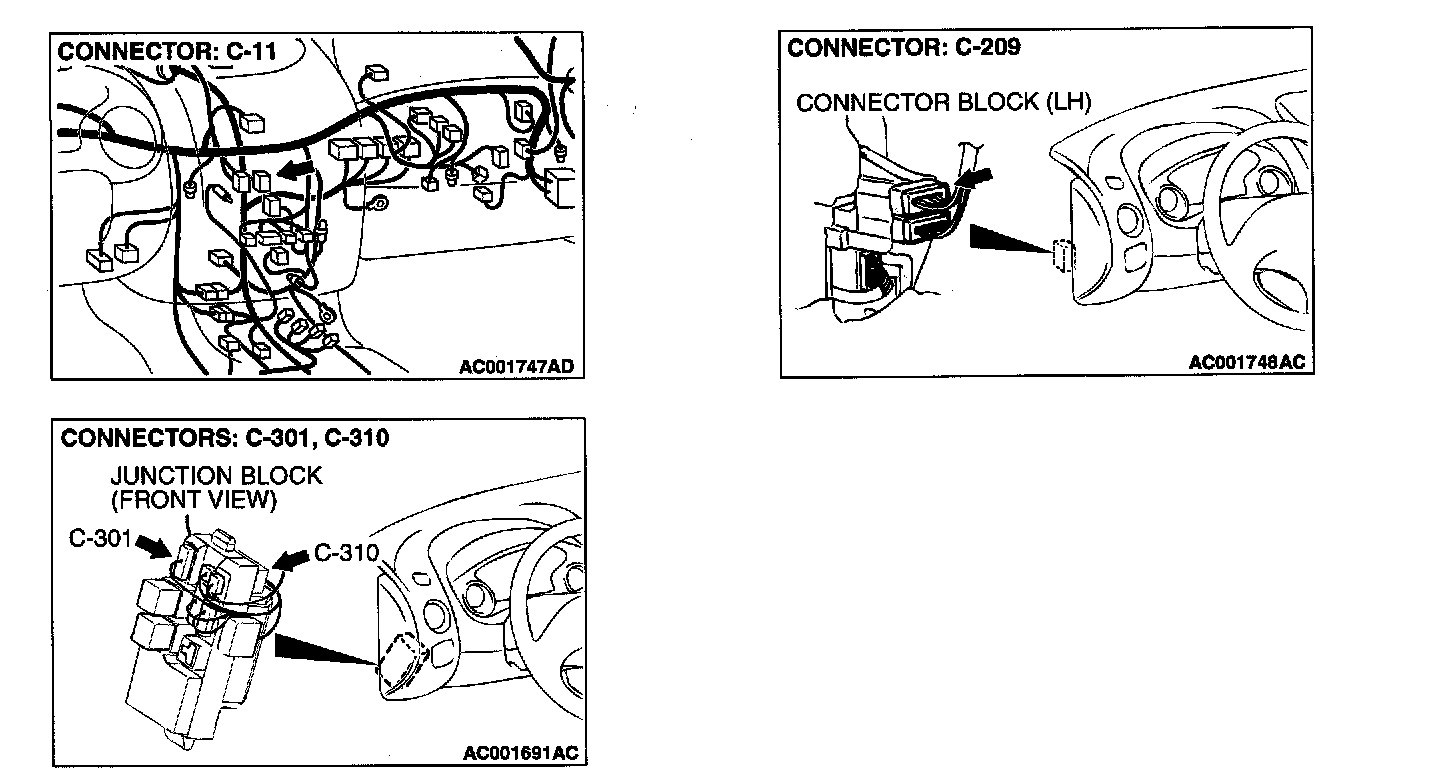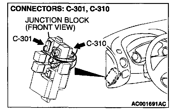 NOTE: After inspecting intermediate connector C-209 and junction block connectors C-301 and C-310, inspect the wire. If intermediate connector C-209 and junction block connectors C-301 and C-310 are damaged, repair or replace them. Refer to Harness Connector Inspection.