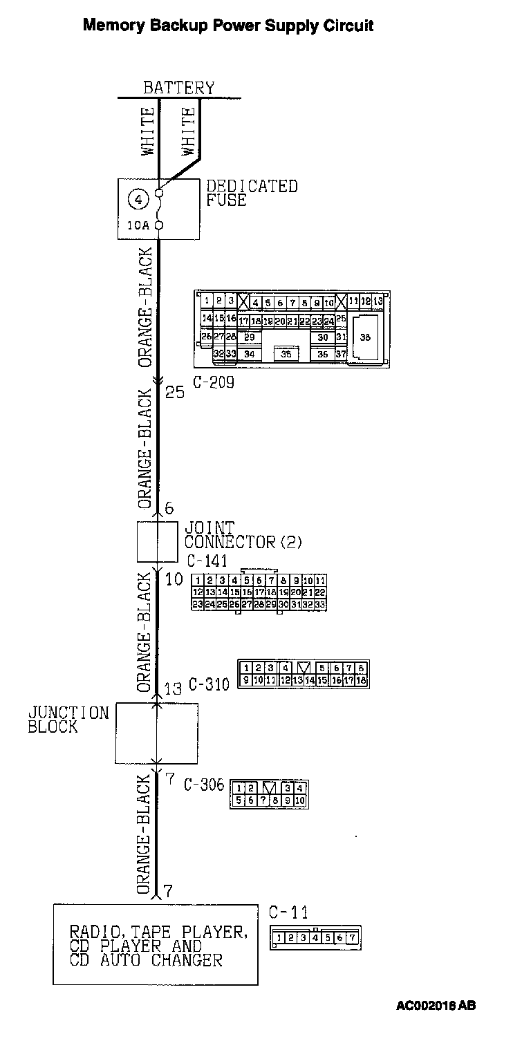 STEP 1. Check the radio, tape player, CD player and CD auto changer memory backup power supply circuit by back probing.