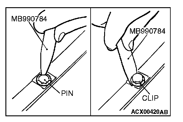 Use special tool MB990784 to pull up the center pin in clip.