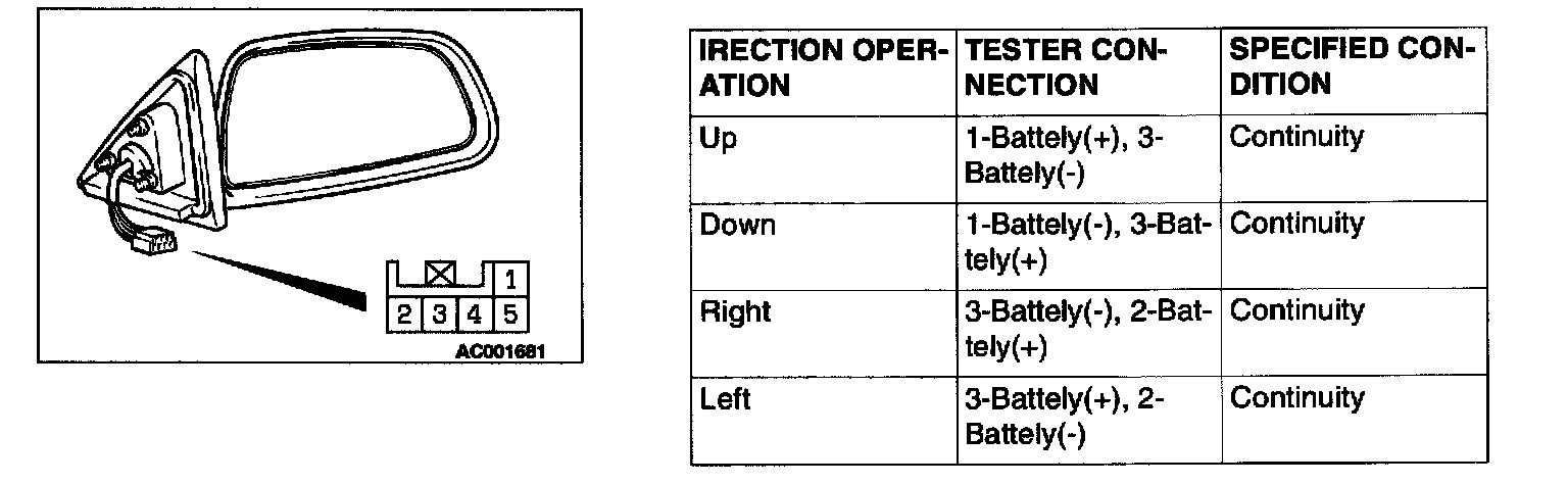 Check that the mirror moves as described in the table when each terminal is connected to the battery.