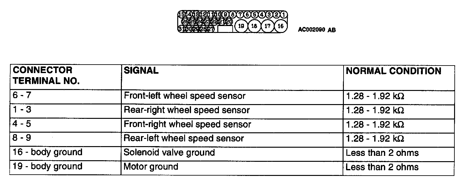 1. Turn the ignition switch to the "LOCK" (OFF) position and disconnect the ABS-ECU connectors before checking resistance and continuity.