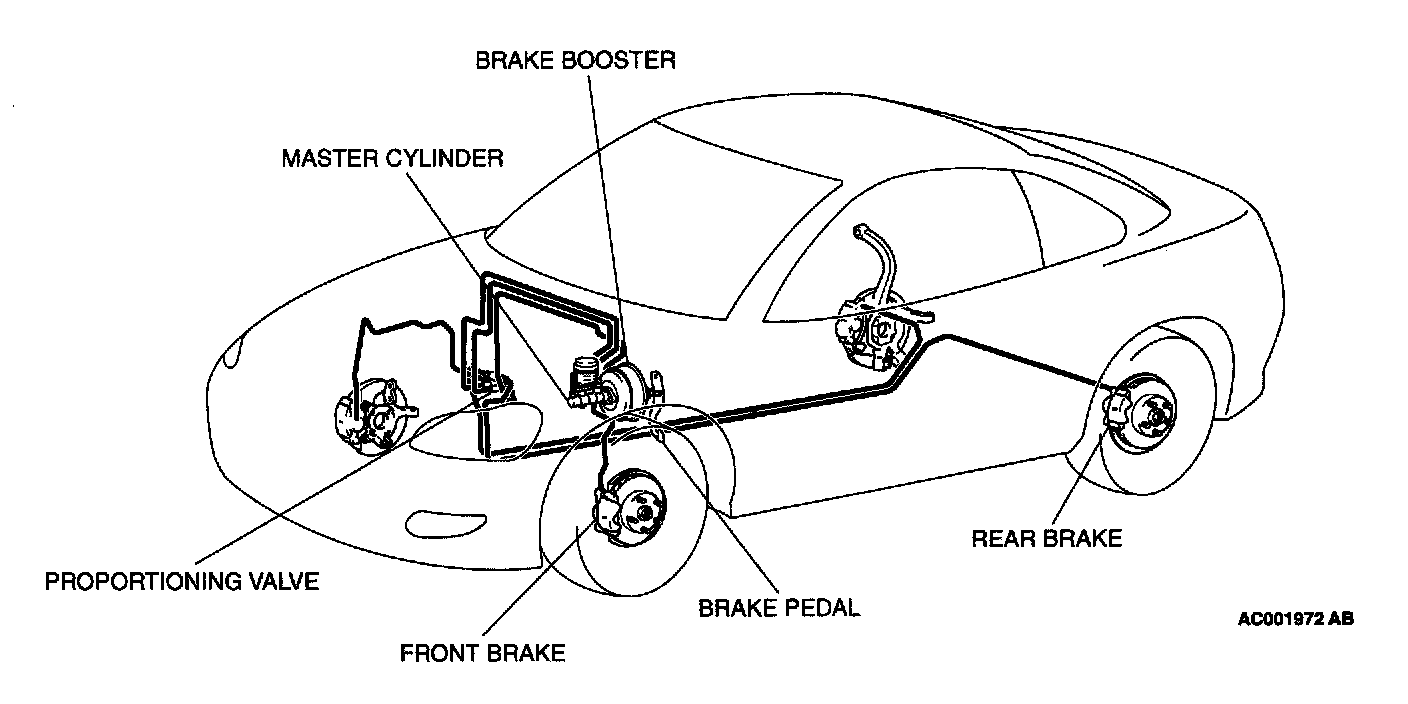 The basic brake system uses a X-type hydraulic feed arrangement. The left front and right rear brakes operate together from the same circuit, right front and left rear operate likewise. If a leak develops in the left front line or piston, the right rear brake would be affected. For safety and control, the right front and left rear circuit operates normally, providing stable braking. In this case, the left front leak must be repaired immediately as the right front left rear circuit is only provided half the braking power required for this vehicle. The main features are as follows:- A tandem type master cylinder is equipped in all models.