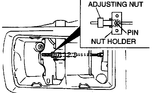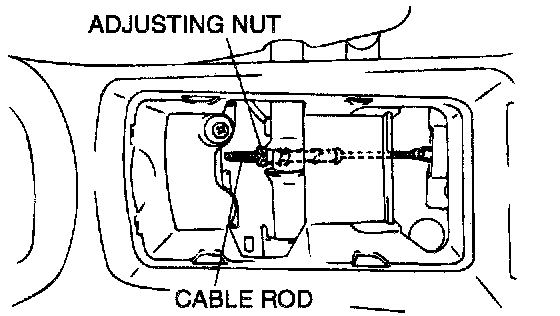 2. If the parking brake lever stroke is not the standard value, adjust as described below. Remove the floor console cup tray or arm rest assembly, loosen the adjusting nut as far as the end of the cable rod to release the cable, and then adjust by the following procedure: