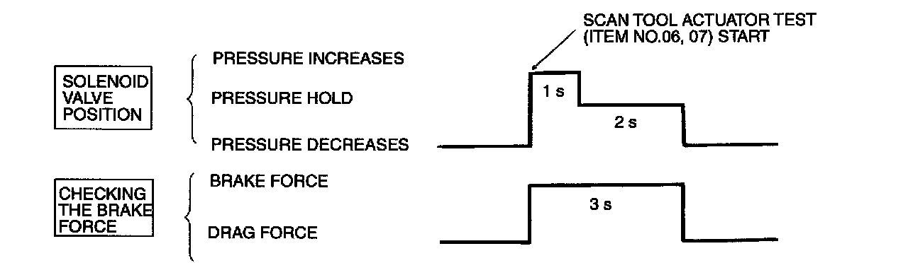 6. Turn the wheel by hand and check the change in braking force. Use a braking force tester. The braking force reading value should change when the actuator test is carried out. The result should be as shown in the diagram above.