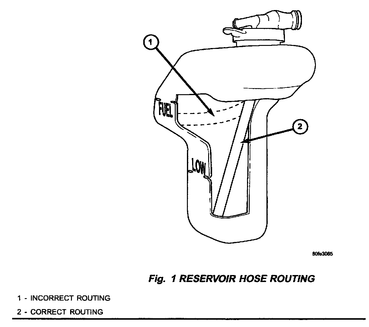 Visually inspect the coolant tank's hose routing. An outline of the hose may be seen as a dark shadow by looking through the reservoir with a light. The hose should reach to the bottom of the tank (Fig. 1). If the hose is caught at the top of the tank, perform the Repair Procedure.