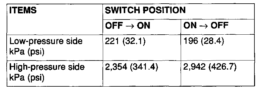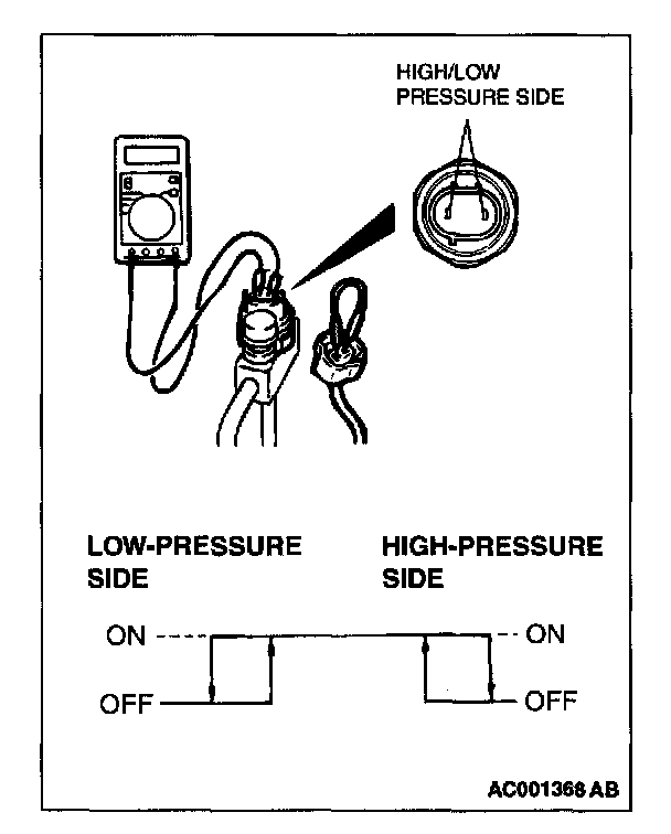 3. When the high/low pressure sides of the dual pressure switch are at operation pressure (ON) and there is continuity between the respective terminals, then the condition is normal. If there is no continuity, replace the switch.