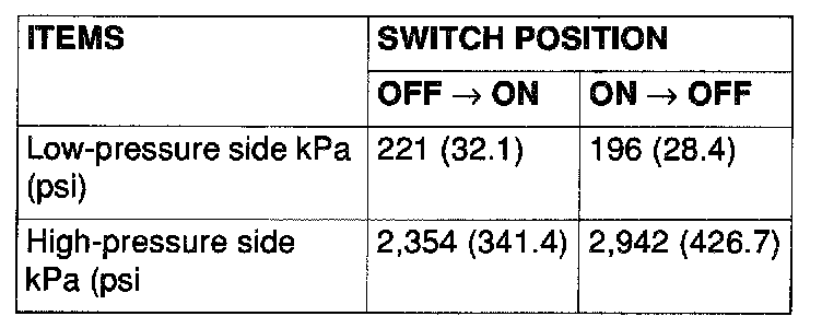 3. When the high/low pressure sides of the dual pressure switch are at operation pressure (ON) and there is continuity between the respective terminals.