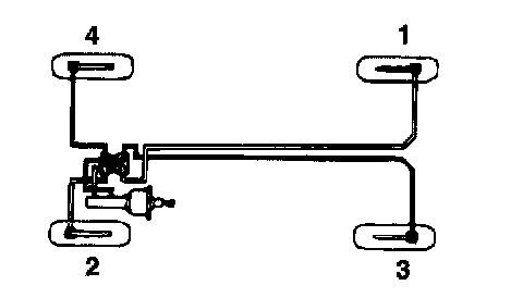 CAUTION: For vehicles equipped with ABS, be sure to filter/strain the brake fluid being added to the master cylinder reservoir tank. Debris may damage the hydraulic unit. Start the engine and bleed the air in the sequence shown in the image.