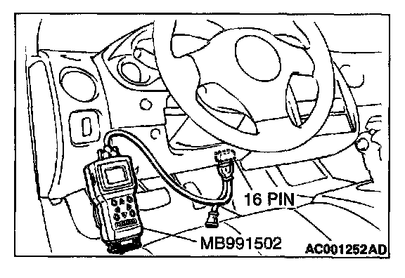 CAUTION:; To prevent damage to scan tool MB991502, always turn the ignition switch to the "LOCK" (OFF) position before connecting or disconnecting scan tool MB991502.