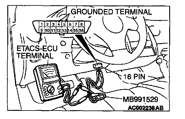 1. Use special tool MB991529 to connect a voltmeter between ground terminal 4 or 5 and ETACS-ECU terminal 9 of the data link connector.