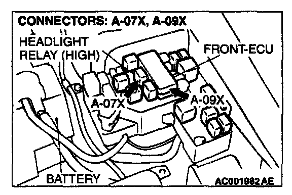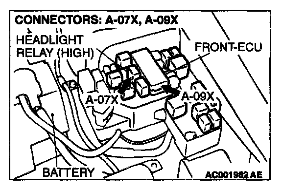 STEP 8.Check headlight relay (high) connector A-07X and front-ECU connector A-09X for damage.