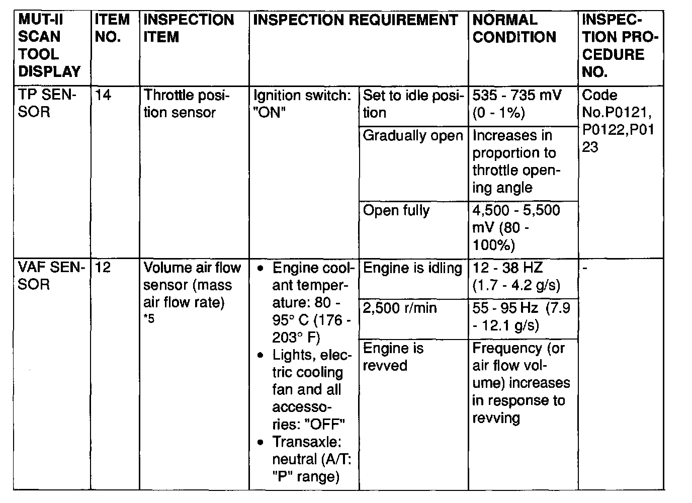 NOTE: *5: In a new vehicle [driven approximately 500 km (311 mile) or less], the volume air flow sensor output frequency is sometimes 10% higher than the standard frequency.