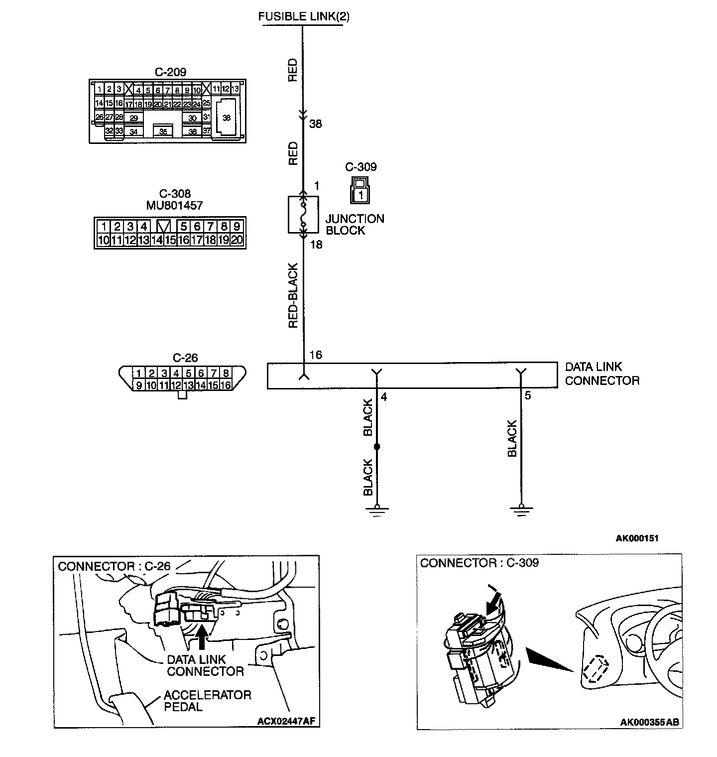 NO: Check harness connectors C-308, C-309 and C-209 at intermediate connector for damage, and repair or replace as required. Refer to Harness Connector Inspection. If intermediate connectors are in good condition, repair harness wire between fusible link (2) and data link connector C-26 terminal 16 because of open circuit. Then confirm that the malfunction symptom is eliminated.