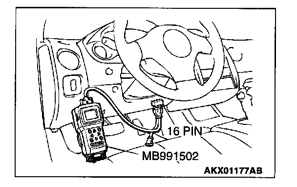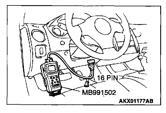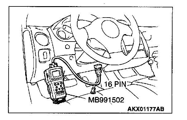 CAUTION: To prevent damage to scan tool MB991502, always turn the ignition switch to the "LOCK" (OFF) position before connecting or disconnecting scan tool MB991502.
