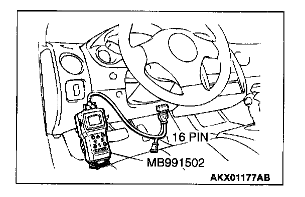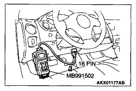 CAUTION: To prevent damage to scan tool MB991502, always turn the ignition switch to the "LOCK" (OFF) position before connecting or disconnecting scan tool MB991502.