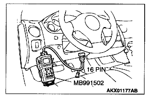 CAUTION: To prevent damage to scan tool MB991502, always turn the ignition switch to the "LOCK" (OFF) position before connecting or disconnecting scan tool MB991502.