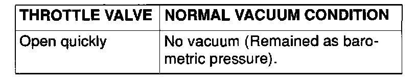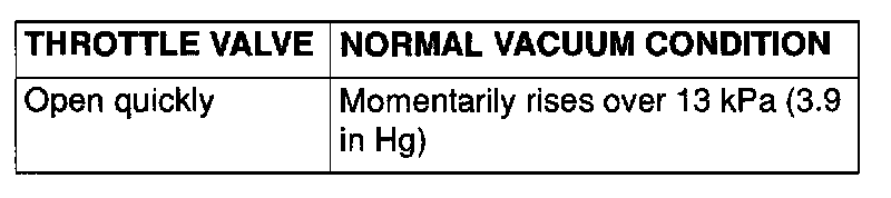 2. Start the engine. Check the vacuum condition when the throttle valve is opened suddenly (revving) during cold and hot engine conditions. If the engine is hot and the vacuum does not rise over 13 kPa (3.9 in Hg), perform the vacuum control valve check and EGR port vacuum check. Then continue to Step 3. If vacuum rises momentarily, proceed to Step 3.