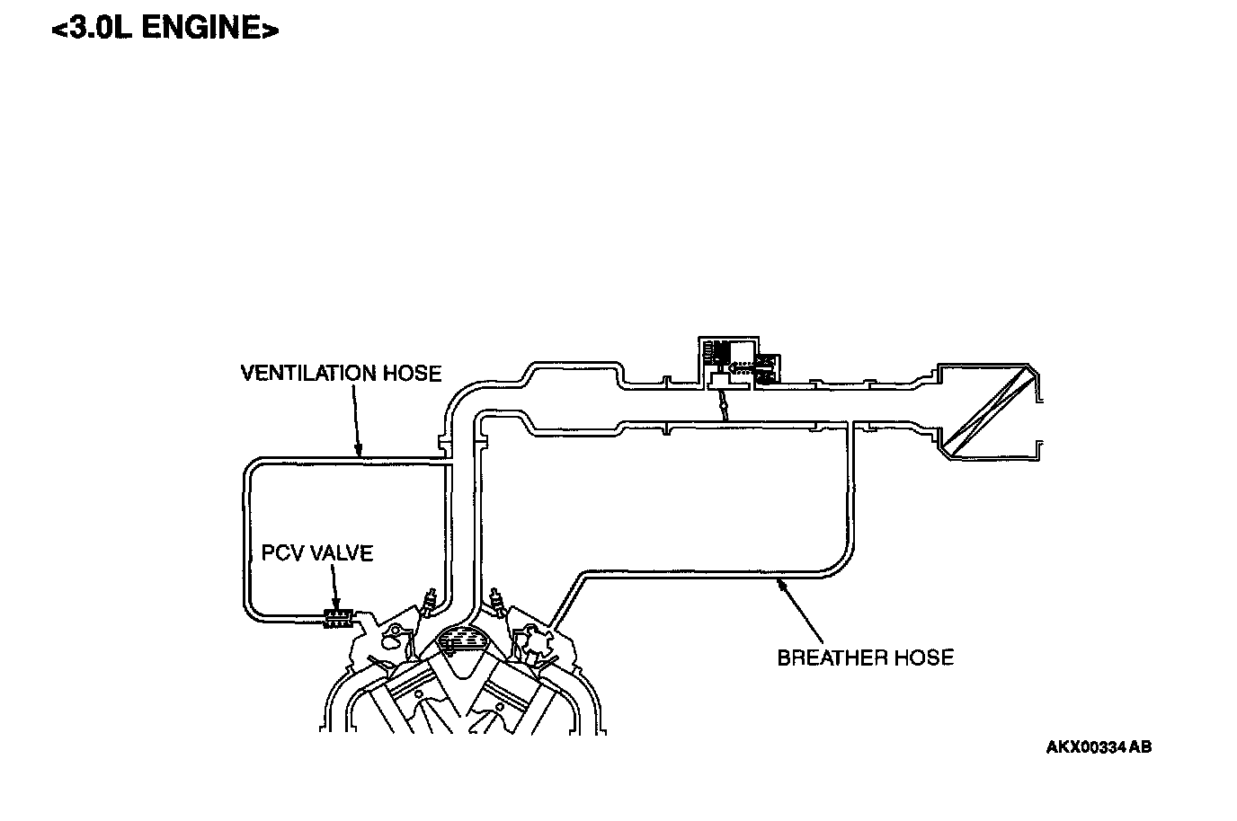 GENERAL INFORMATIONThe positive crankcase ventilation system is a system for preventing the escape of blow-by gases from inside the crankcase into the atmosphere. Fresh air is sent from the air cleaner into the crankcase through the breather hose to be mixed with the blow-by gas inside the crankcase. The blow-by gas inside the crankcase is drawn into the intake manifold through the positive crankcase ventilation (PCV) valve.