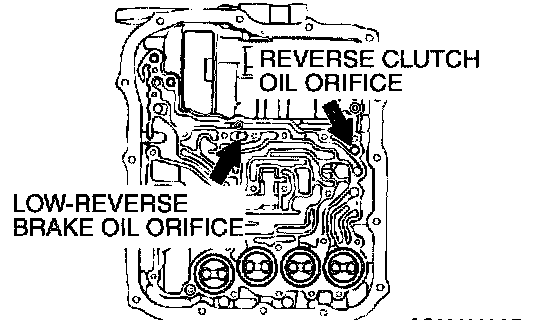 2) Blow compressed air into the reverse clutch oil orifice of the transaxle case, and check if the reverse clutch piston moves and air pressures are maintained in that condition. Repeat for the low-reverse brake.