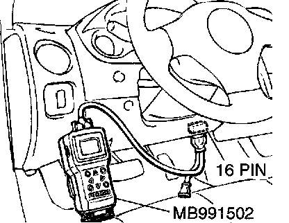 CAUTION: To prevent damage to the scan tool MB991502, always turn the ignition switch to "LOCK" (OFF) position before connecting or disconnecting the scan tool MB991502.