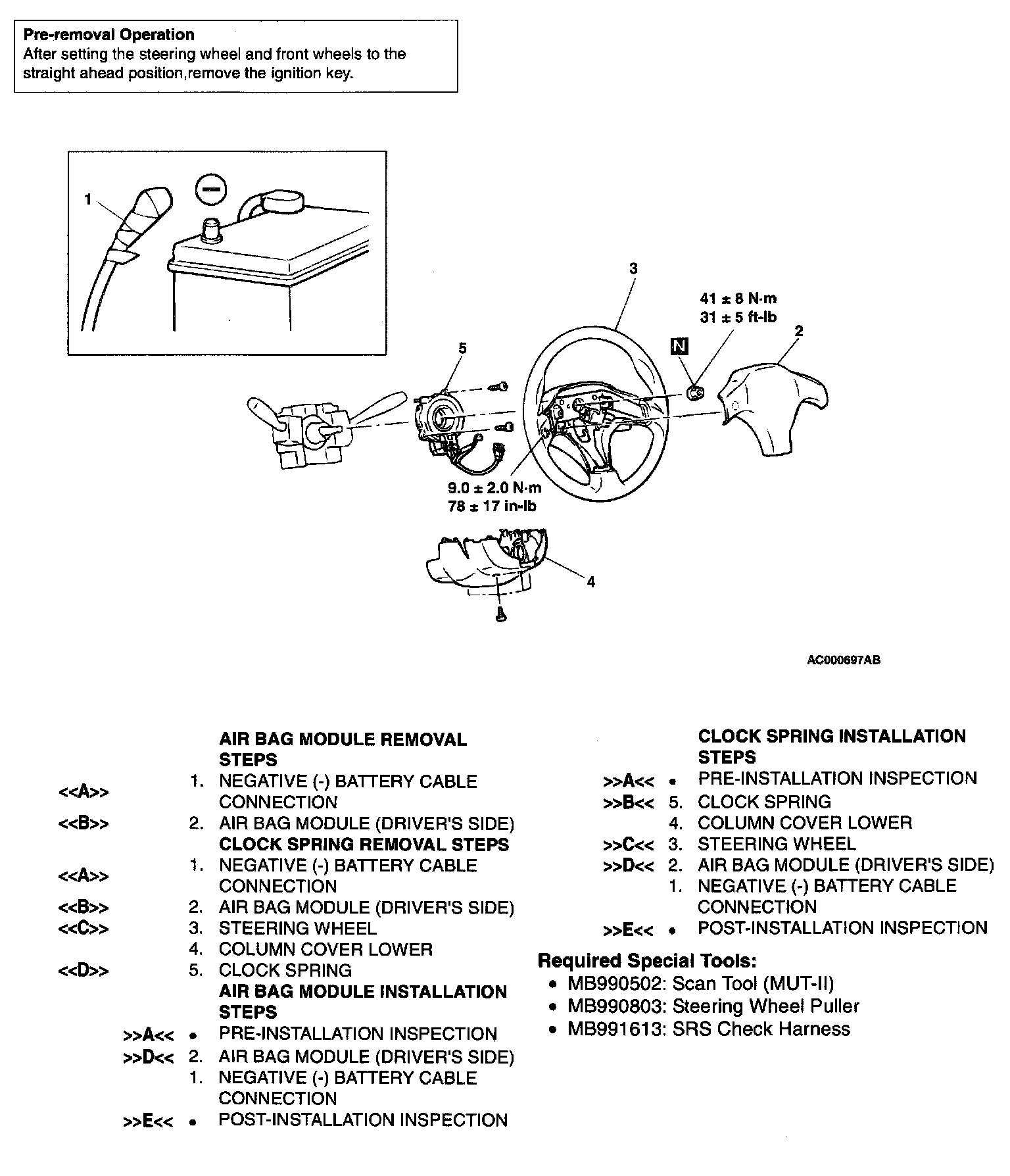 - Never attempt to disassemble or repair the air bag modules or clock spring. If faulty, replace it.