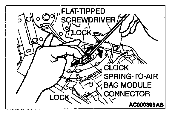 2. When disconnecting the connector of the clock spring from the air bag module, press the air bag's lock toward the outer side to spread to open. Use a flat-tipped screwdriver, as shown in the figure, to pry gently to remove the connector.