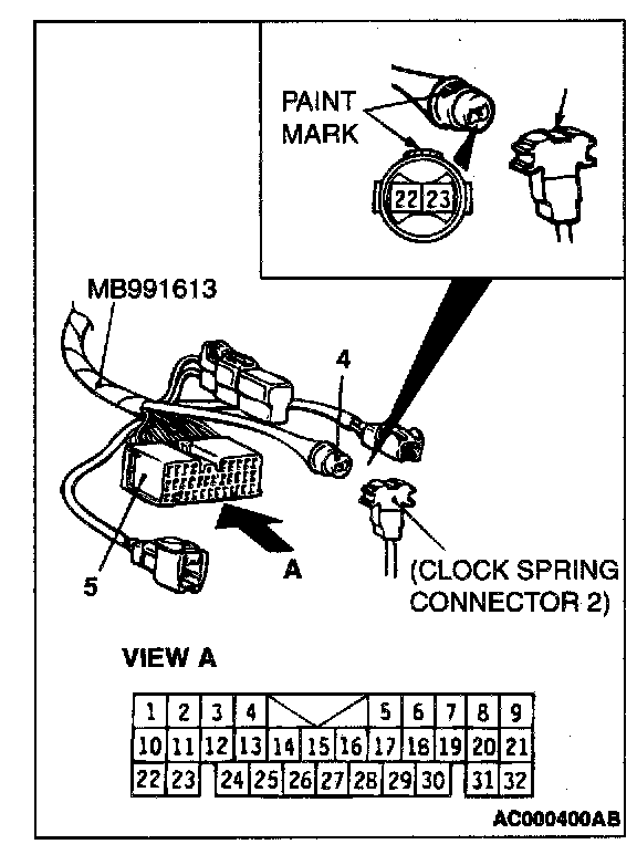 3. Align the paint mark of special tool MB991613 connector number 4 with the notch in clock spring connector number 2 (arrow in the illustration) to connect the connectors number 2 and 4.