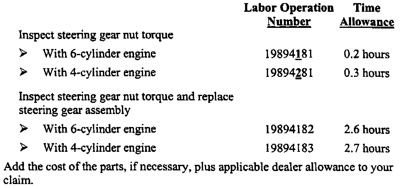 If inspection determines that steering gear replacement is required and the vehicle must be held overnight, dealers should attempt to minimize customer inconvenience by placing the owner in a loaner vehicle.