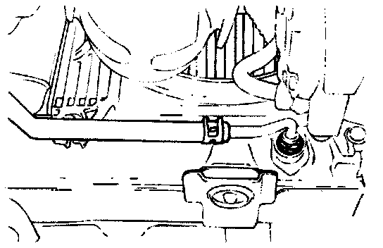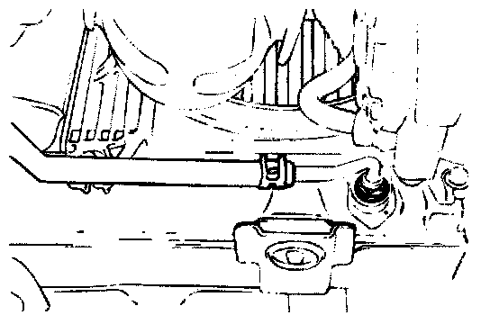 1. Disconnect the hose shown in the illustration which connects the transaxle and the oil cooler (inside the radiator). Place a container under the hose to collect the discharge.