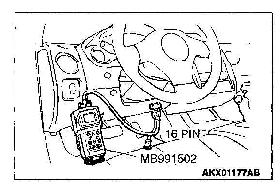 CAUTION: To prevent damage to scan tool MB991502, always turn the ignition switch to the "LOCK" (OFF) position before connecting or disconnecting scan tool MB991502.