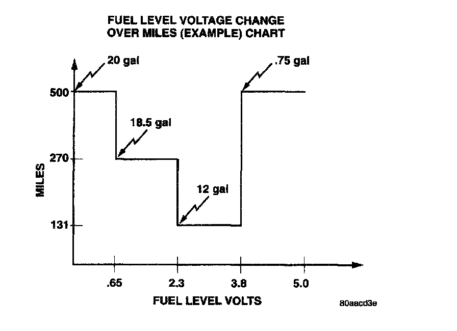 TEST # 2: If the PCM does not see a change in the fuel level of .1765 over a set amount of miles the test will fail. See Fuel Level Voltage Change Over Miles Chart for an example.